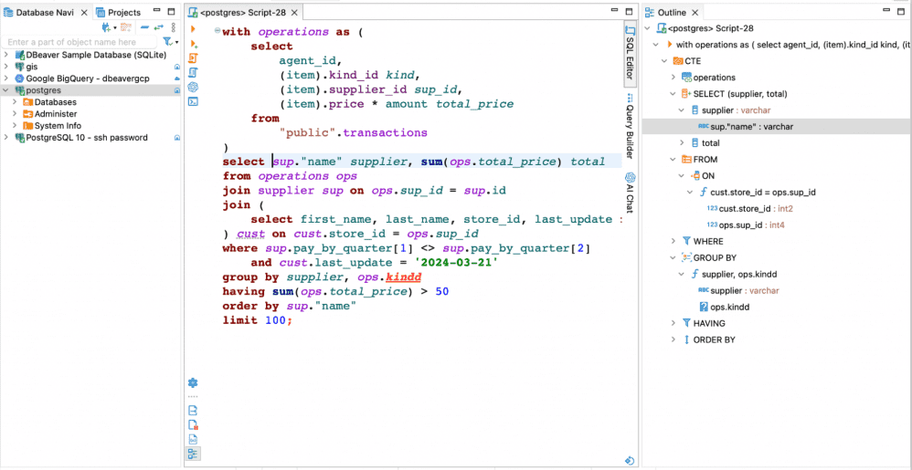 כלי שאילתת SQL רב תכליתי לפיתוח, ביצוע, אחסון, ייצוא ושימוש חוזר בסקריפטים עם פונקציות פרופיל נתונים ועיצוב.